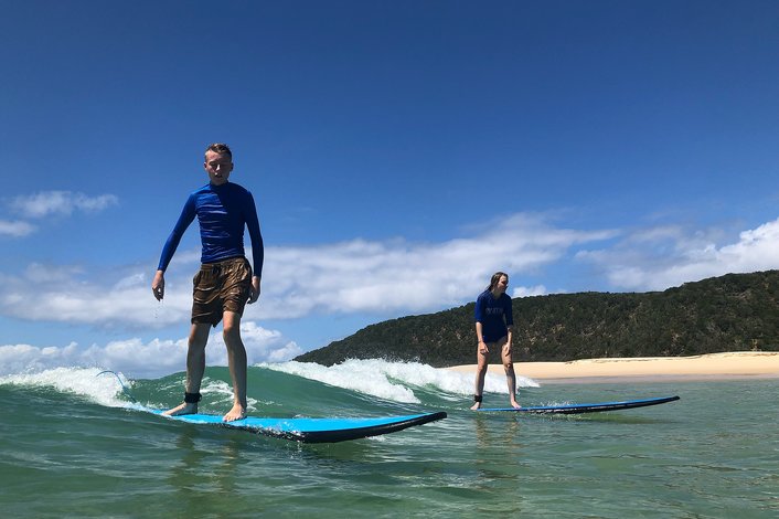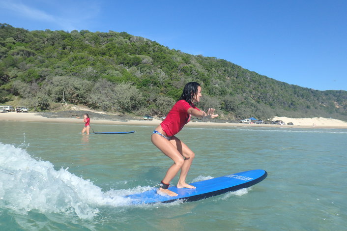 Learn to Surf Noosa at Sunshine Coast’s hidden surfing paradise only accessible by 4WD vehicles through the Great Sandy National Park. We take you on a unique beach 4X4 surf adventure at Noosa to the spectacular Double Island Point. This ideal surf location features a long sandy point break with waves that seem to go forever and one of the easiest most satisfying waves you can ever learn to surf on. You could be riding waves for 100’s of meters on your first learn to surf lesson.